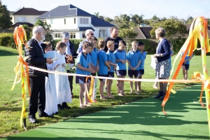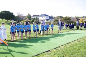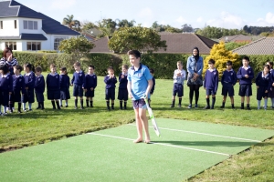 Father Terry blessed our cricket pitch and the children sang beautifully ‘Ka Waiata.’ Mr Barry Vernon, our cricket coach, spoke to us all with the school cricket team standing proudly beside him. It was special to have Mrs Shelley Main, Oscar’s teacher last year, cut the ribbon to signal the cricket pitch was opened. Mr Vernon bowled the first ball to Oscar, which he hit far!!