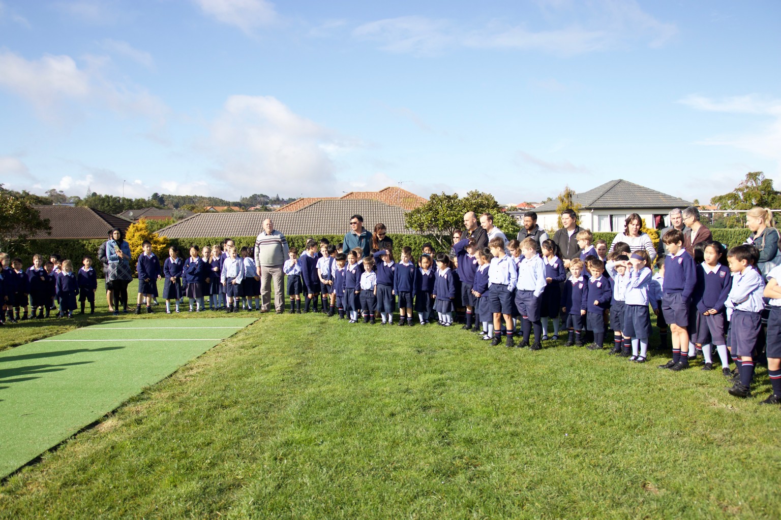 Father Terry blessed our cricket pitch and the children sang beautifully ‘Ka Waiata.’ Mr Barry Vernon, our cricket coach, spoke to us all with the school cricket team standing proudly beside him. It was special to have Mrs Shelley Main, Oscar’s teacher last year, cut the ribbon to signal the cricket pitch was opened. Mr Vernon bowled the first ball to Oscar, which he hit far!!