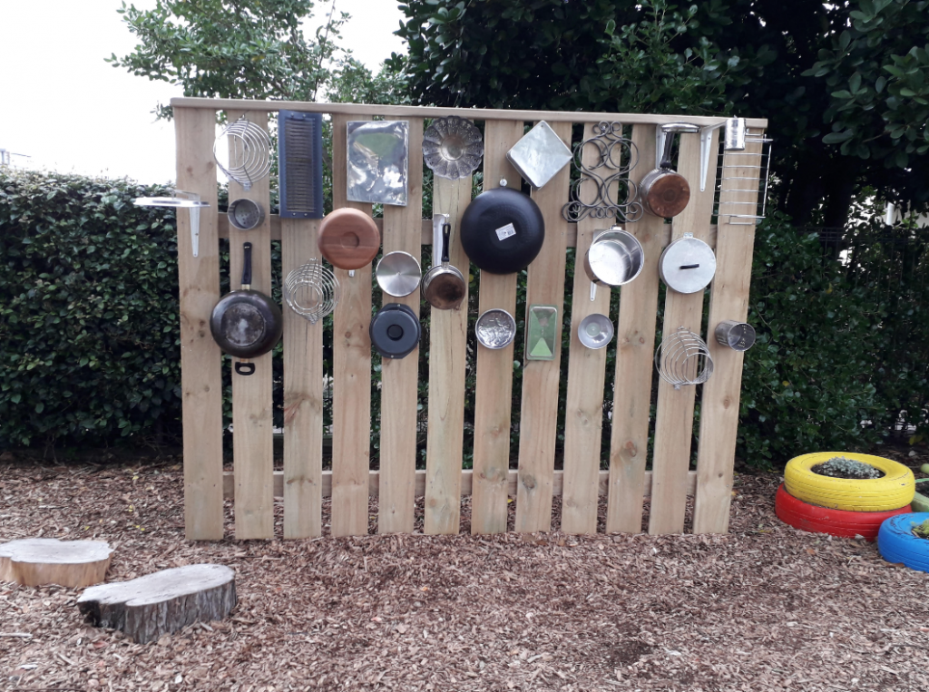 Last year Room 14 created a garden on the top field for the children to play in and enjoy. This included a playhouse, table and chairs made out of tree trunks and a tyre garden. As part of their plan, they wanted a music wall for the children to enjoy. Lots of different objects were collected and Mr Baird has spent the last few weeks building it for us. Let the beautiful sounds begin!!