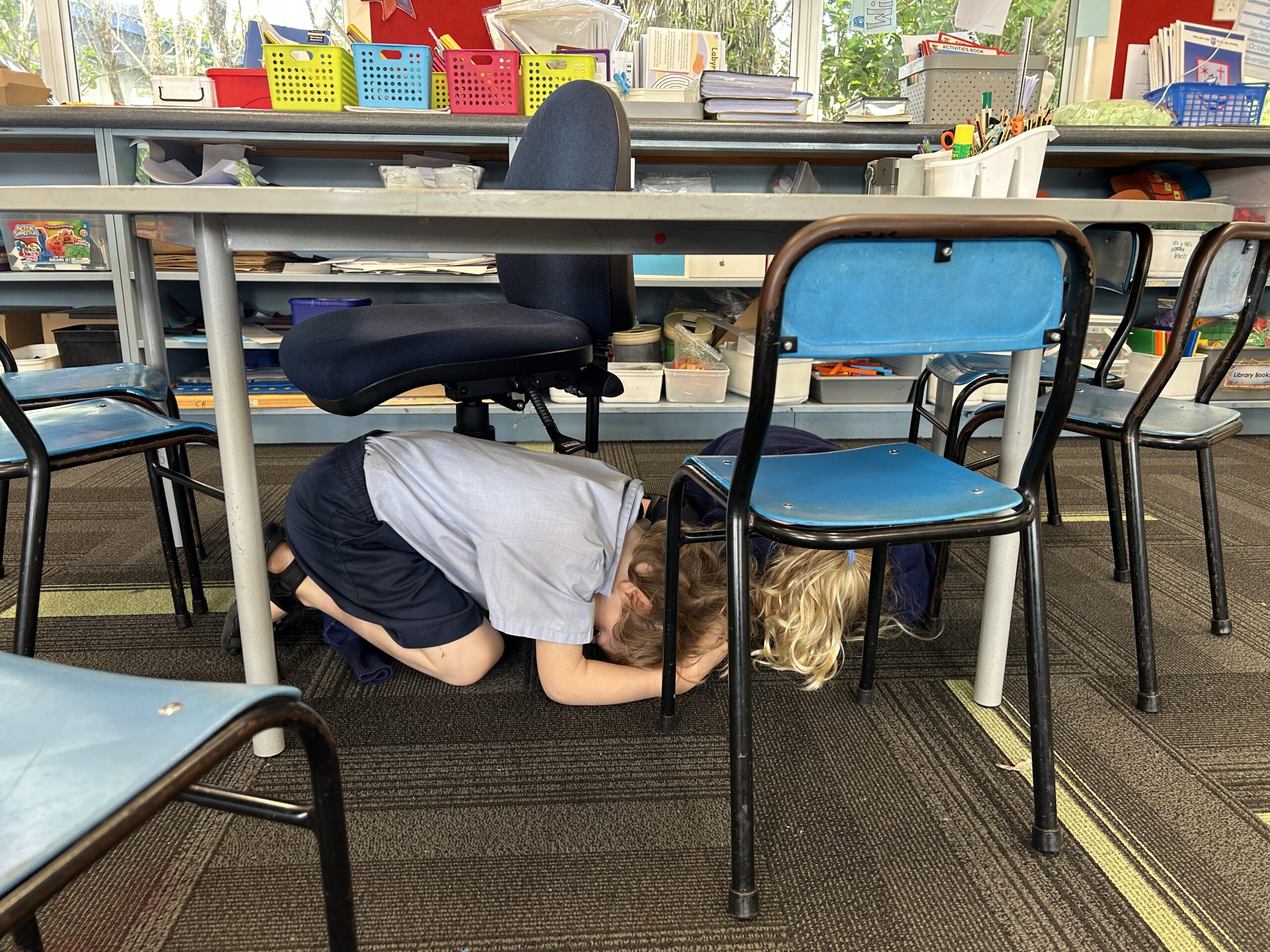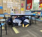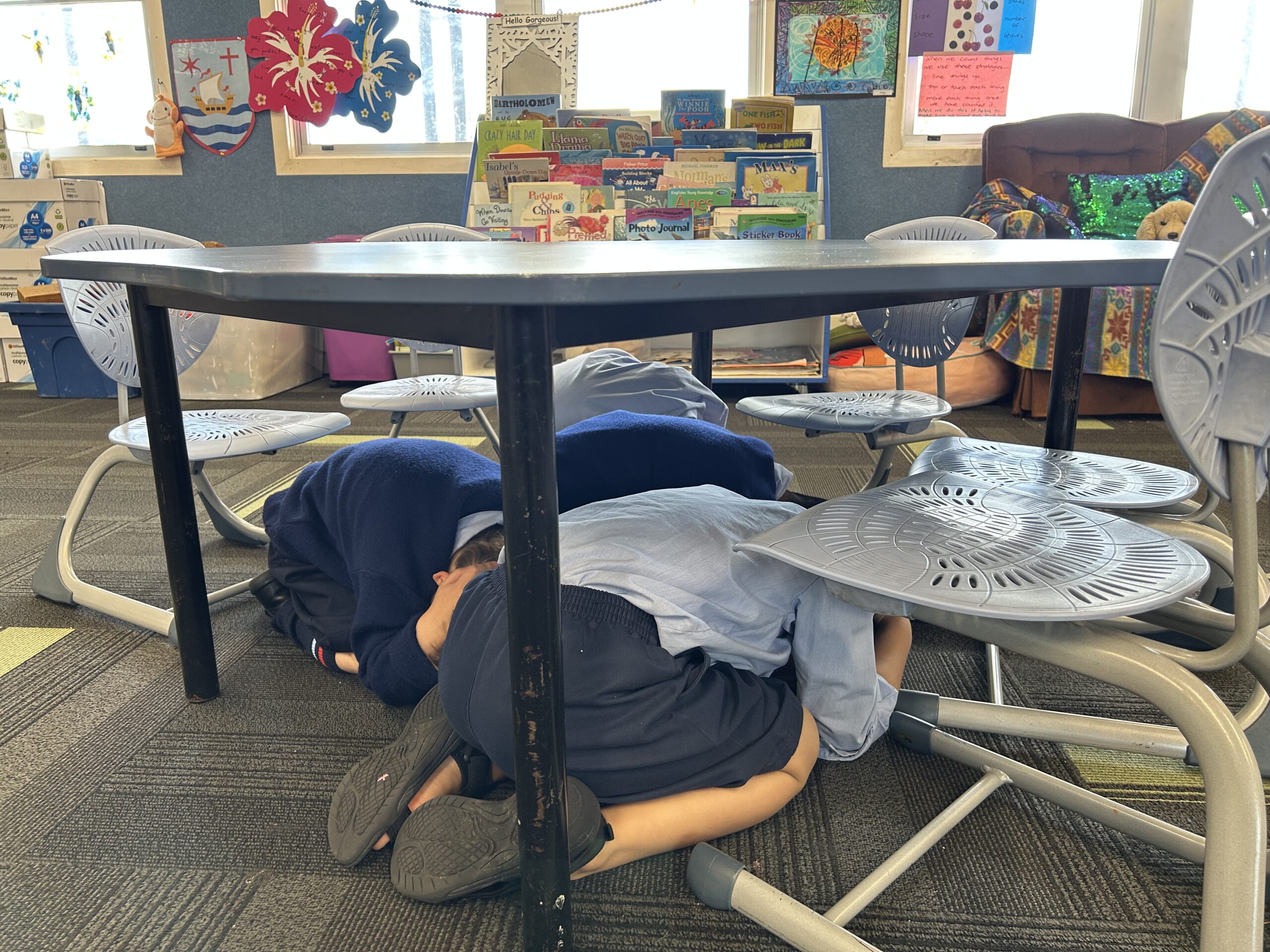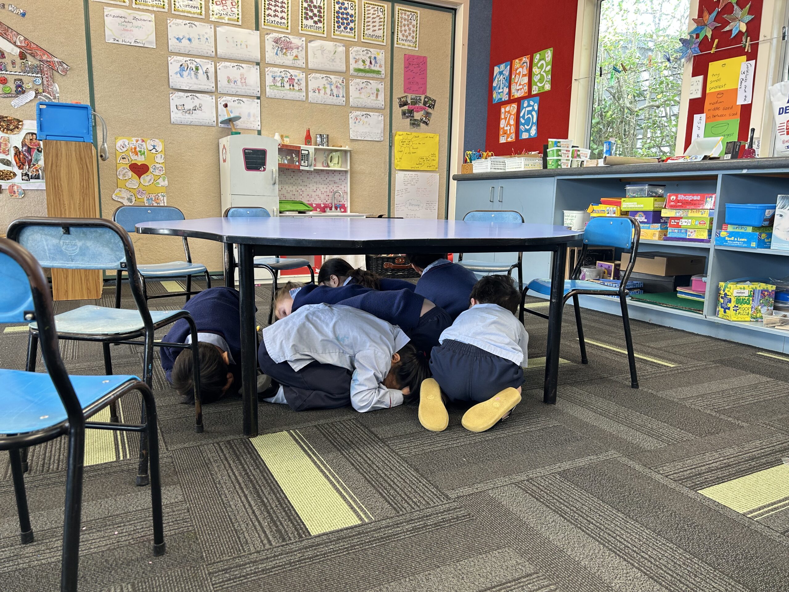 On Thursday 16 October at 9.30am, the school joined the rest of New Zealand and participated in the National Earthquake Drill. Children learnt and practiced to drop, cover, hold if they feel shaking in an earthquake, like a turtle. If they were close to a table they got underneath it and covered their head with their arms. Here are some of our newest students practicing the drill. Well done Room 10!