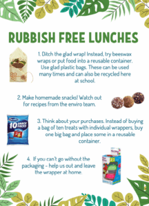 We have noticed a huge improvement in the number of rubbish free lunches from Week 1 to Week 2, so thank you so much for supporting our Enviro team initiative. If you are choosing lunch food that is packaged, there is still rubbish that goes to the landfill even if it doesn’t come to school. It is our hope that families will take this opportunity to have a discussion as a family and look for ways you can reduce the amount of plastic your family uses. This could be buying a large bag/container of your favourite food and putting it into containers for the lunch boxes therefore avoiding multiple packets. If we all do a little bit, it will make a big difference to our world and future generations.